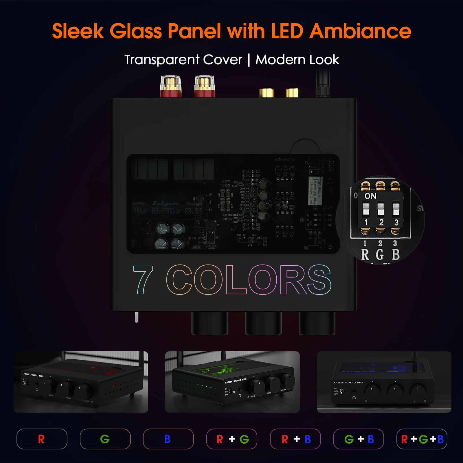 거실과 스튜디오를 위한 멋진 디자인: 세련되고 현대적인 컴팩트 파워 앰프에는 투명 패널과 조절 가능한 내부 LED 조명이 장착되어 있습니다.다양한 색상 옵션은 미래 지향적인 외관을 만들어 홈 오디오 설정이나 스튜디오에 세련미를 더해줍니다.